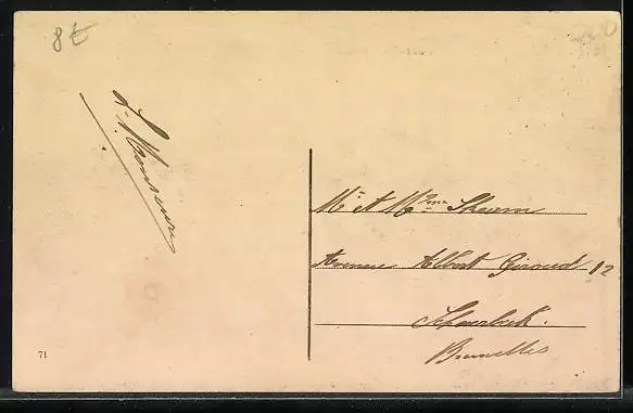 Personenbezogene Daten auf der Rückseite der Karte wurden durch blauen Textmarker unkenntlich gemacht. Die blauen Stellen sind auf die Vorderseite durchgeweicht und wirken sich negativ auf das Postkartenfoto aus