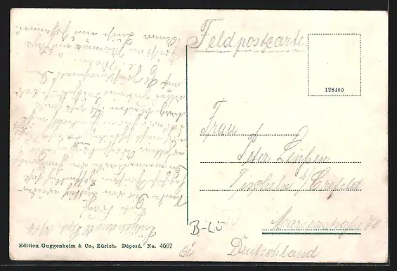 Personenbezogene Daten auf der Rückseite der Karte wurden durch blauen Textmarker unkenntlich gemacht. Die blauen Stellen sind auf die Vorderseite durchgeweicht und wirken sich negativ auf das Postkartenfoto aus