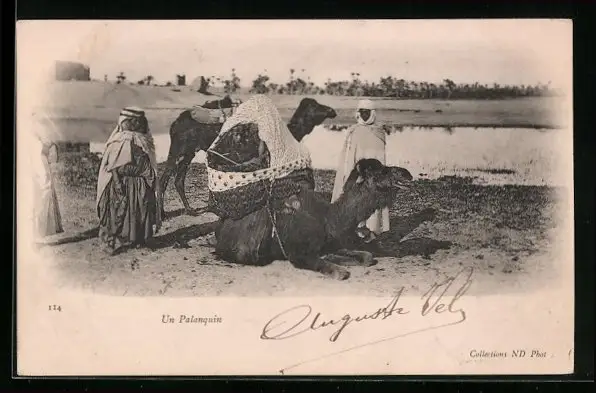 AK Liegendes Kamel mit geschlossenem Tragekorb und weiblichem Fahrgast