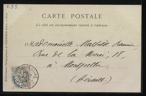 Personenbezogene Daten auf der Rückseite der Karte wurden durch blauen Textmarker unkenntlich gemacht. Die blauen Stellen sind auf die Vorderseite durchgeweicht und wirken sich negativ auf das Postkartenfoto aus