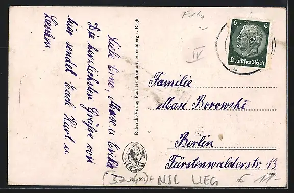 Personenbezogene Daten auf der Rückseite der Karte wurden durch blauen Textmarker unkenntlich gemacht. Die blauen Stellen sind auf die Vorderseite durchgeweicht und wirken sich negativ auf das Postkartenfoto aus