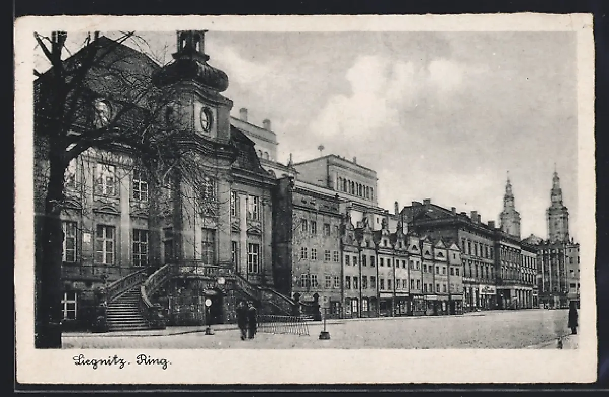 AK Liegnitz, Ring, Strassenpartie mit Turmgebäuden