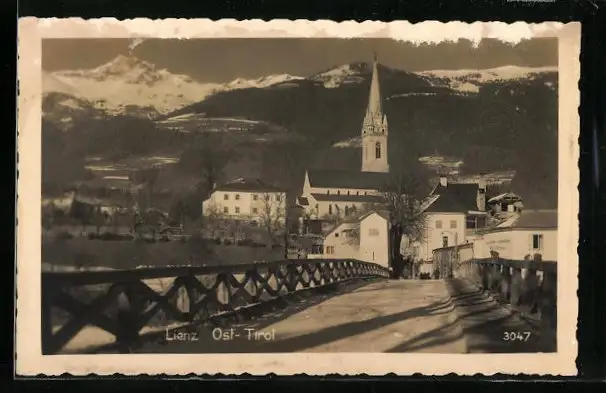 AK Lienz, Ortspartie mit Kirche und Brücke