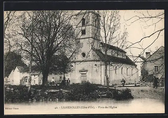 AK Lignerolles, Place de l`Église avec des habitants et des arbres