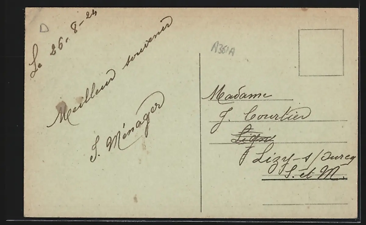 Personenbezogene Daten auf der Rückseite der Karte wurden durch blauen Textmarker unkenntlich gemacht. Die blauen Stellen sind auf die Vorderseite durchgeweicht und wirken sich negativ auf das Postkartenfoto aus