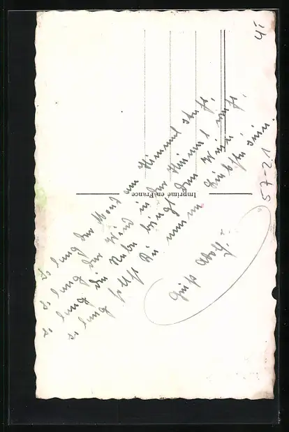 Personenbezogene Daten auf der Rückseite der Karte wurden durch blauen Textmarker unkenntlich gemacht. Die blauen Stellen sind auf die Vorderseite durchgeweicht und wirken sich negativ auf das Postkartenfoto aus