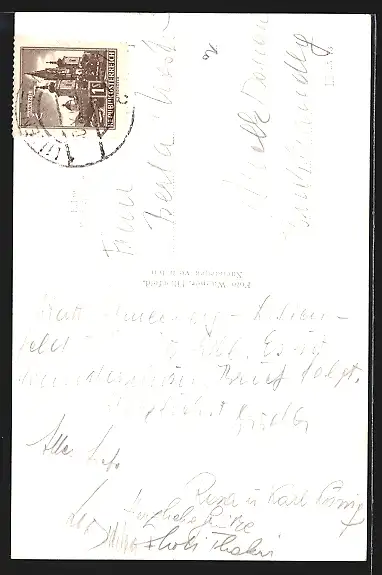 Personenbezogene Daten auf der Rückseite der Karte wurden durch blauen Textmarker unkenntlich gemacht. Die blauen Stellen sind auf die Vorderseite durchgeweicht und wirken sich negativ auf das Postkartenfoto aus