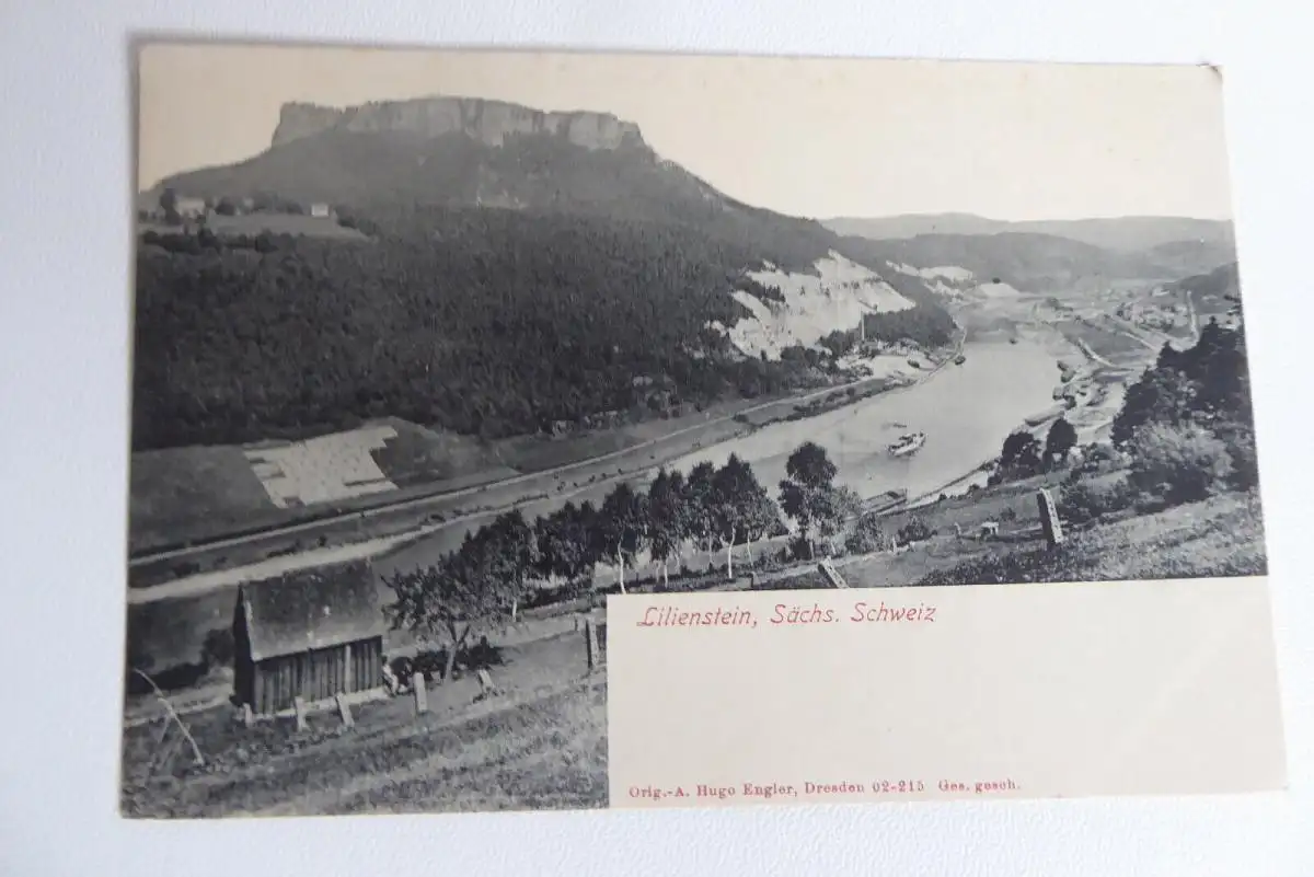 Orig.-A. Hugo Engler, Dresden. Ungelaufen, rückseitig handschriftl. Bemerkung "O Lilienstein! Eine mühevolle, aber schöne Kraxelei! 1907 F.K." Gut erhalten.