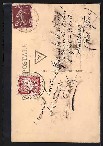 Personenbezogene Daten auf der Rückseite der Karte wurden durch blauen Textmarker unkenntlich gemacht. Die blauen Stellen sind auf die Vorderseite durchgeweicht und wirken sich negativ auf das Postkartenfoto aus