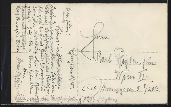 Personenbezogene Daten auf der Rückseite der Karte wurden durch blauen Textmarker unkenntlich gemacht. Die blauen Stellen sind auf die Vorderseite durchgeweicht und wirken sich negativ auf das Postkartenfoto aus