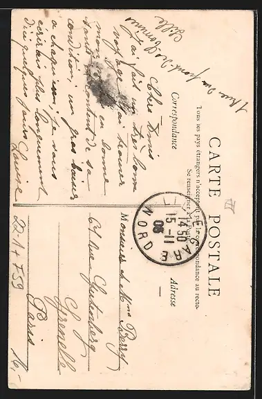 Personenbezogene Daten auf der Rückseite der Karte wurden durch blauen Textmarker unkenntlich gemacht. Die blauen Stellen sind auf die Vorderseite durchgeweicht und wirken sich negativ auf das Postkartenfoto aus