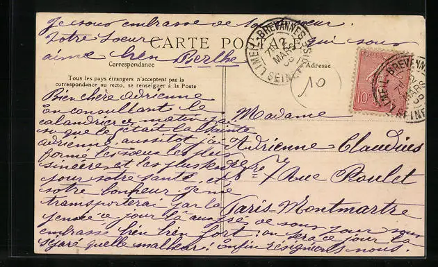 Personenbezogene Daten auf der Rückseite der Karte wurden durch blauen Textmarker unkenntlich gemacht. Die blauen Stellen sind auf die Vorderseite durchgeweicht und wirken sich negativ auf das Postkartenfoto aus