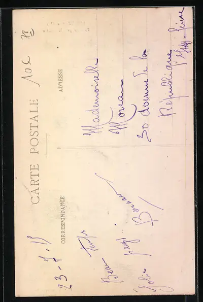 Personenbezogene Daten auf der Rückseite der Karte wurden durch blauen Textmarker unkenntlich gemacht. Die blauen Stellen sind auf die Vorderseite durchgeweicht und wirken sich negativ auf das Postkartenfoto aus
