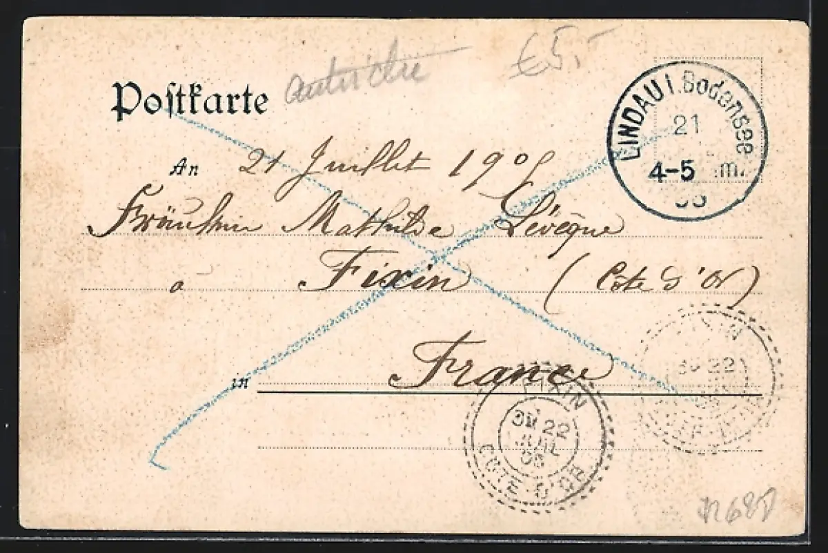 Personenbezogene Daten auf der Rückseite der Karte wurden durch blauen Textmarker unkenntlich gemacht. Die blauen Stellen sind auf die Vorderseite durchgeweicht und wirken sich negativ auf das Postkartenfoto aus