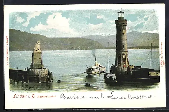 AK Lindau / Bodensee, Hafeneinfahrt, Dampfer, Leuchtturm