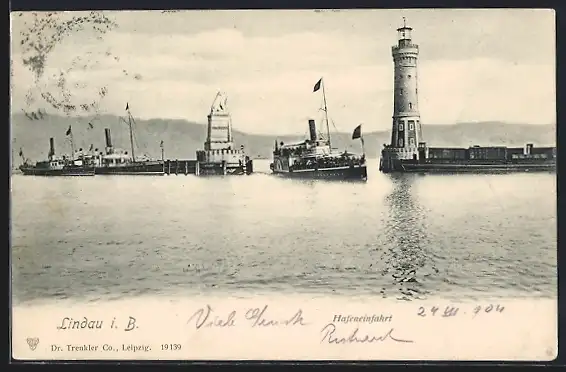 AK Lindau / Bodensee, Hafeneinfahrt mit einlaufendem Passagierdampfer, Leuchtturm