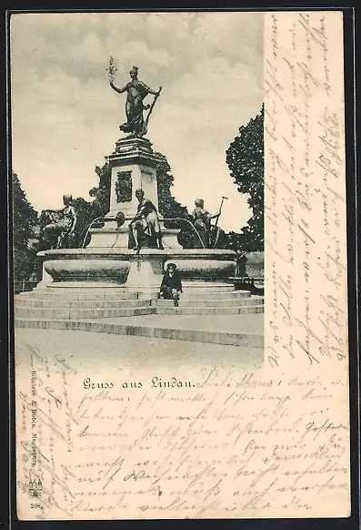 AK Lindau / Bodensee, Partie am Brunnen mit Statue