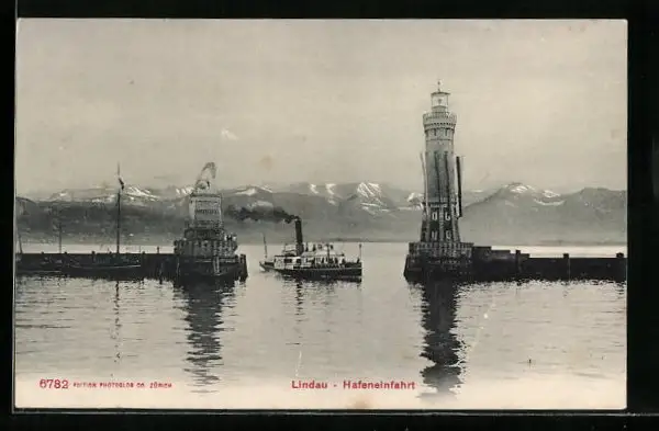 AK Lindau, Hafeneinfahrt mit Dampfer