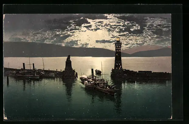 AK Lindau, Hafeneinfahrt mit Dampfer