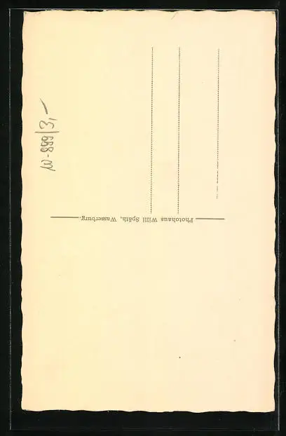 Personenbezogene Daten auf der Rückseite der Karte wurden durch blauen Textmarker unkenntlich gemacht. Die blauen Stellen sind auf die Vorderseite durchgeweicht und wirken sich negativ auf das Postkartenfoto aus
