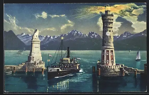AK Lindau i. B., Dampfer bei der Hafeneinfahrt
