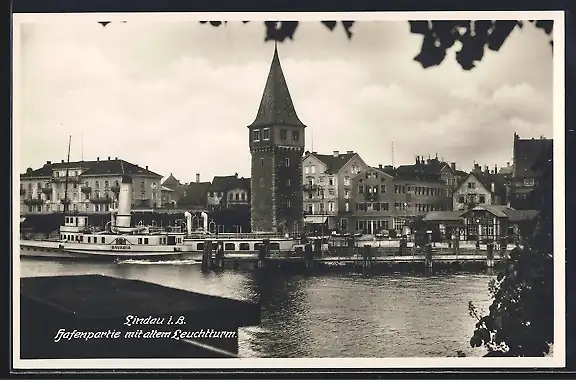 AK Lindau i. B., Hafenpartie mit altem Leuchtturm und Dampfer Bavaria
