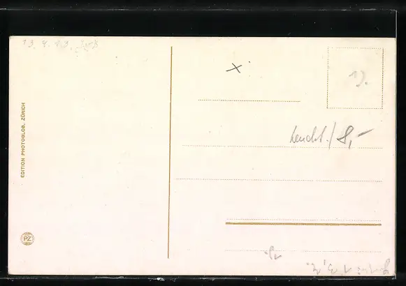 Personenbezogene Daten auf der Rückseite der Karte wurden durch blauen Textmarker unkenntlich gemacht. Die blauen Stellen sind auf die Vorderseite durchgeweicht und wirken sich negativ auf das Postkartenfoto aus