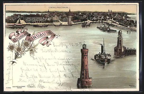 AK Lindau i. B., Panoramablick mit Leuchtturm