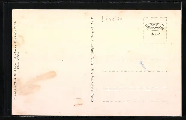 Personenbezogene Daten auf der Rückseite der Karte wurden durch blauen Textmarker unkenntlich gemacht. Die blauen Stellen sind auf die Vorderseite durchgeweicht und wirken sich negativ auf das Postkartenfoto aus
