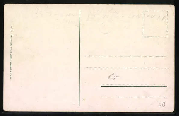 Personenbezogene Daten auf der Rückseite der Karte wurden durch blauen Textmarker unkenntlich gemacht. Die blauen Stellen sind auf die Vorderseite durchgeweicht und wirken sich negativ auf das Postkartenfoto aus