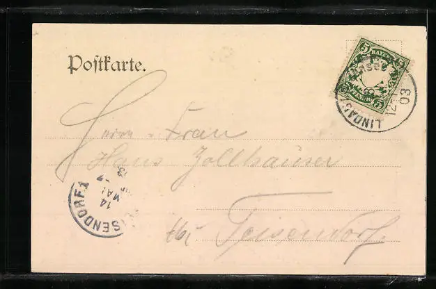 Personenbezogene Daten auf der Rückseite der Karte wurden durch blauen Textmarker unkenntlich gemacht. Die blauen Stellen sind auf die Vorderseite durchgeweicht und wirken sich negativ auf das Postkartenfoto aus