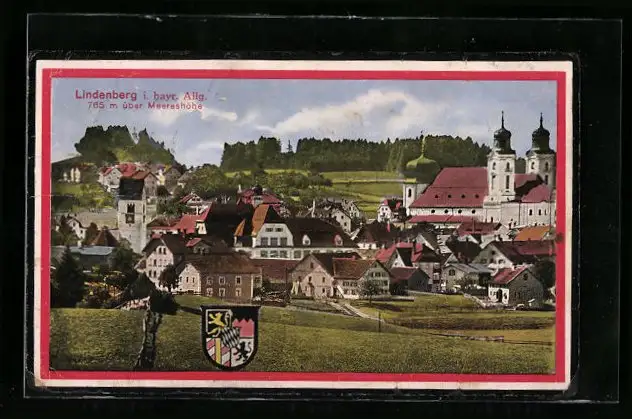 AK Lindenberg i. bayr. Allg., Ortsansicht mit Blick auf die Kirche, Wappen