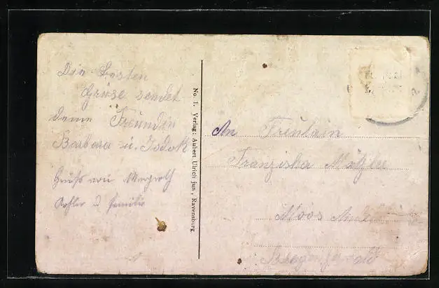 Personenbezogene Daten auf der Rückseite der Karte wurden durch blauen Textmarker unkenntlich gemacht. Die blauen Stellen sind auf die Vorderseite durchgeweicht und wirken sich negativ auf das Postkartenfoto aus