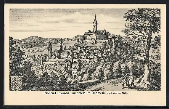 AK Lindenfels, Ansicht der Stadt im Jahre 1630 nach Merian, Wappen