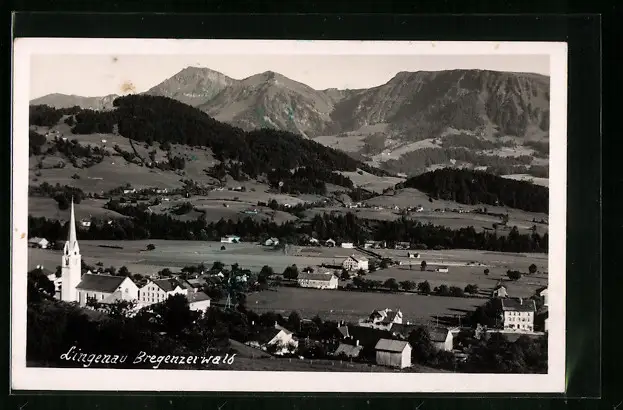 AK Lingenau, Ortsansicht aus der Vogelschau mit felsiger Bergkette