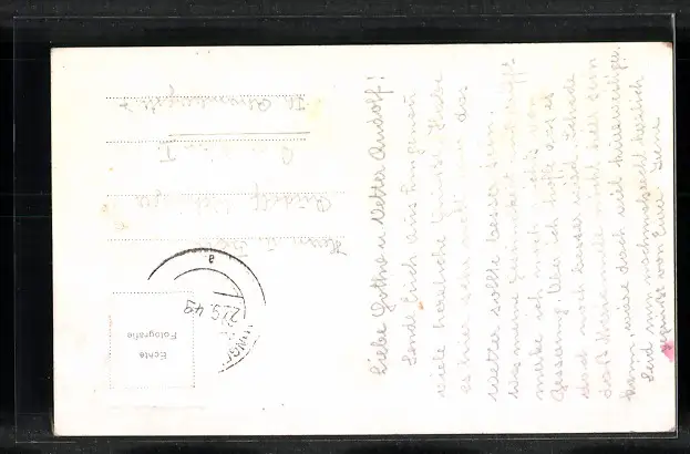 Personenbezogene Daten auf der Rückseite der Karte wurden durch blauen Textmarker unkenntlich gemacht. Die blauen Stellen sind auf die Vorderseite durchgeweicht und wirken sich negativ auf das Postkartenfoto aus