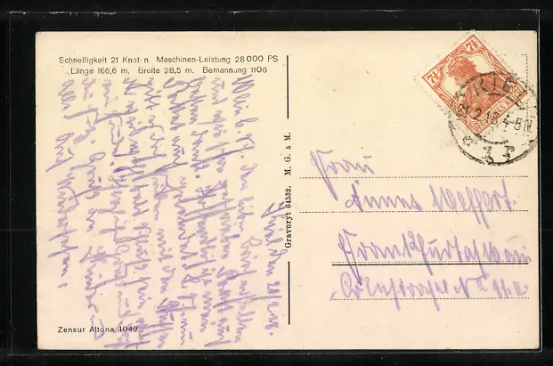 Personenbezogene Daten auf der Rückseite der Karte wurden durch blauen Textmarker unkenntlich gemacht. Die blauen Stellen sind auf die Vorderseite durchgeweicht und wirken sich negativ auf das Postkartenfoto aus