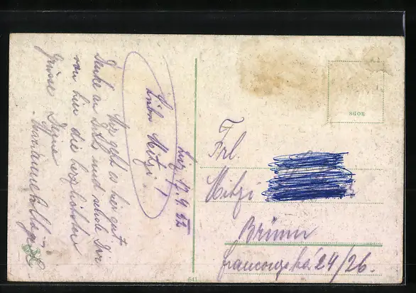 Personenbezogene Daten auf der Rückseite der Karte wurden durch blauen Textmarker unkenntlich gemacht. Die blauen Stellen sind auf die Vorderseite durchgeweicht und wirken sich negativ auf das Postkartenfoto aus