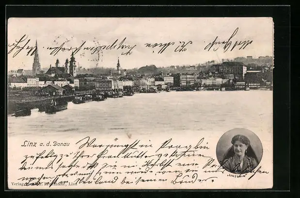 AK Linz /Donau, Ortsansicht vom Wasser aus, Linzerin