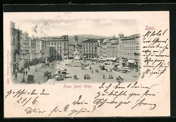 AK Linz, Franz Josef-Platz mit Geschäften und Denkmal