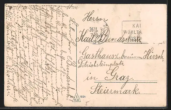 alte Ansichtskarte, gelaufen, Briefmarke entfernt, rückseitig Oberflächenschaden, guter Zustand