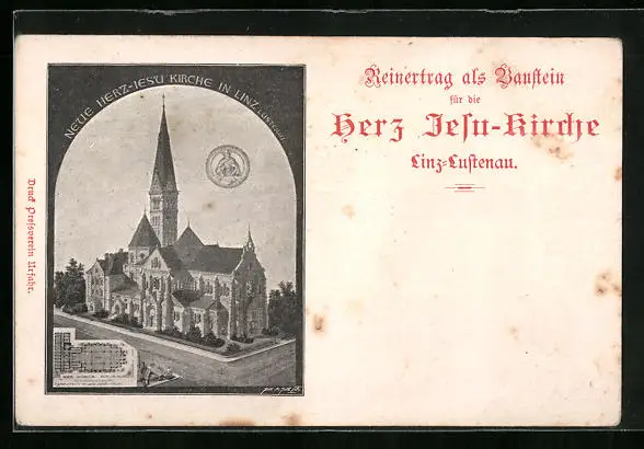 AK Linz-Lustenau, Neue Herz-Jesu-Kirche, Aussenansicht, Bauplan Innenansicht