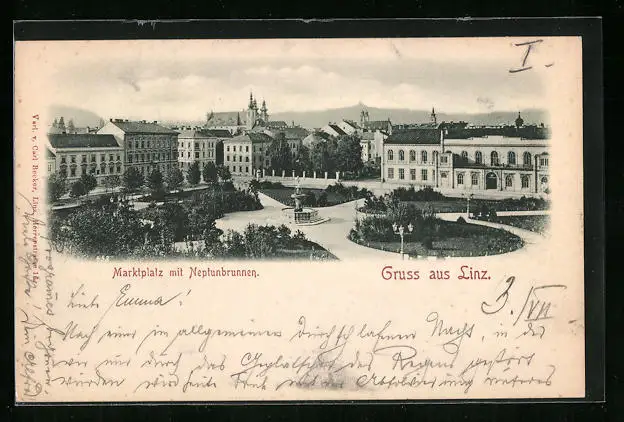 AK Linz, Marktplatz mit Neptunbrunnen