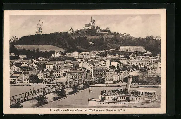 AK Linz-Urfahr, Donaubrücke mit Pöstlingsberg und Dampfer