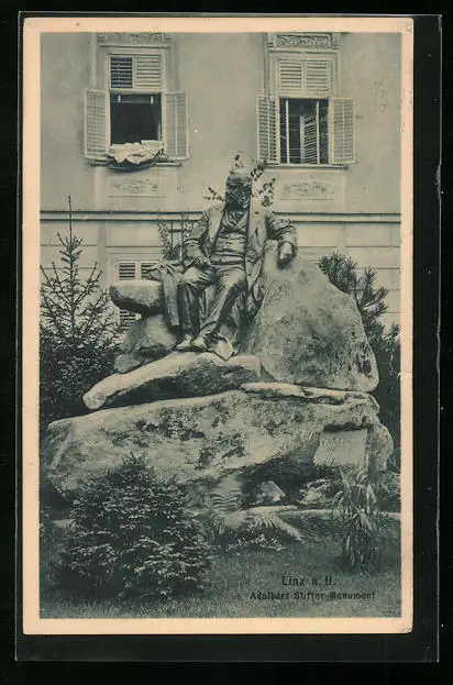 AK Linz a. D., Adalbert Stifter-Denkmal in grüner Umgebung