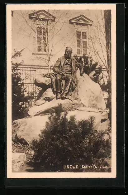 AK Linz a. D., Adalbert Stifter-Denkmal vor Fensterfront