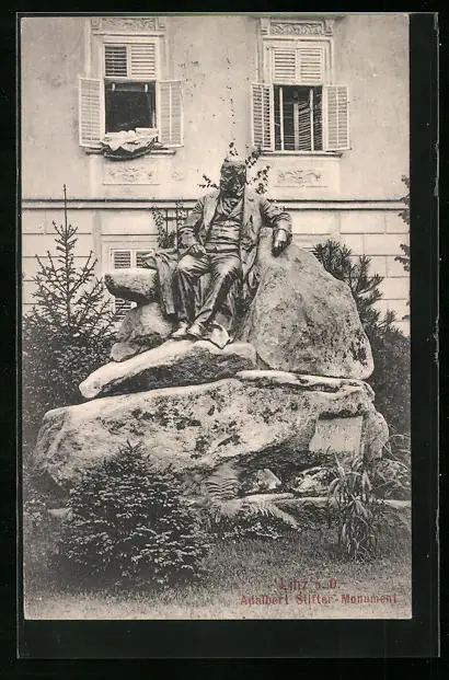 AK Linz a. D., Adalbert Stifter-Denkmal vor offenen Fensterläden