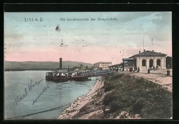 AK Linz a. D., Am Landungsplatz der Dampfschiffe