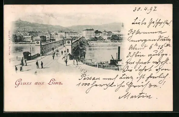 AK Linz a. D., Brücke mit Blick auf Urfahr