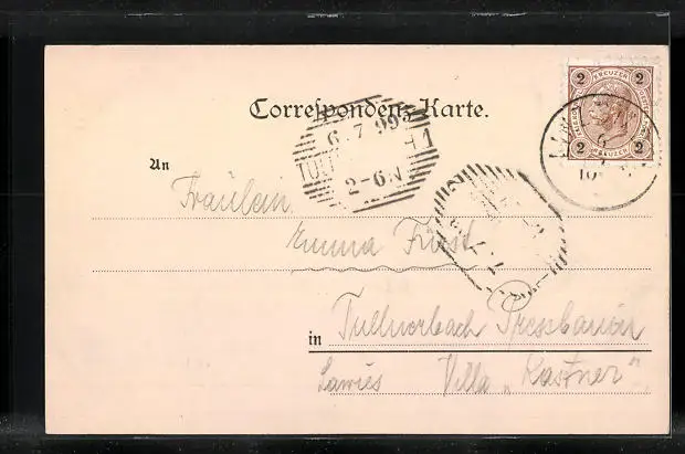 Personenbezogene Daten auf der Rückseite der Karte wurden durch blauen Textmarker unkenntlich gemacht. Die blauen Stellen sind auf die Vorderseite durchgeweicht und wirken sich negativ auf das Postkartenfoto aus